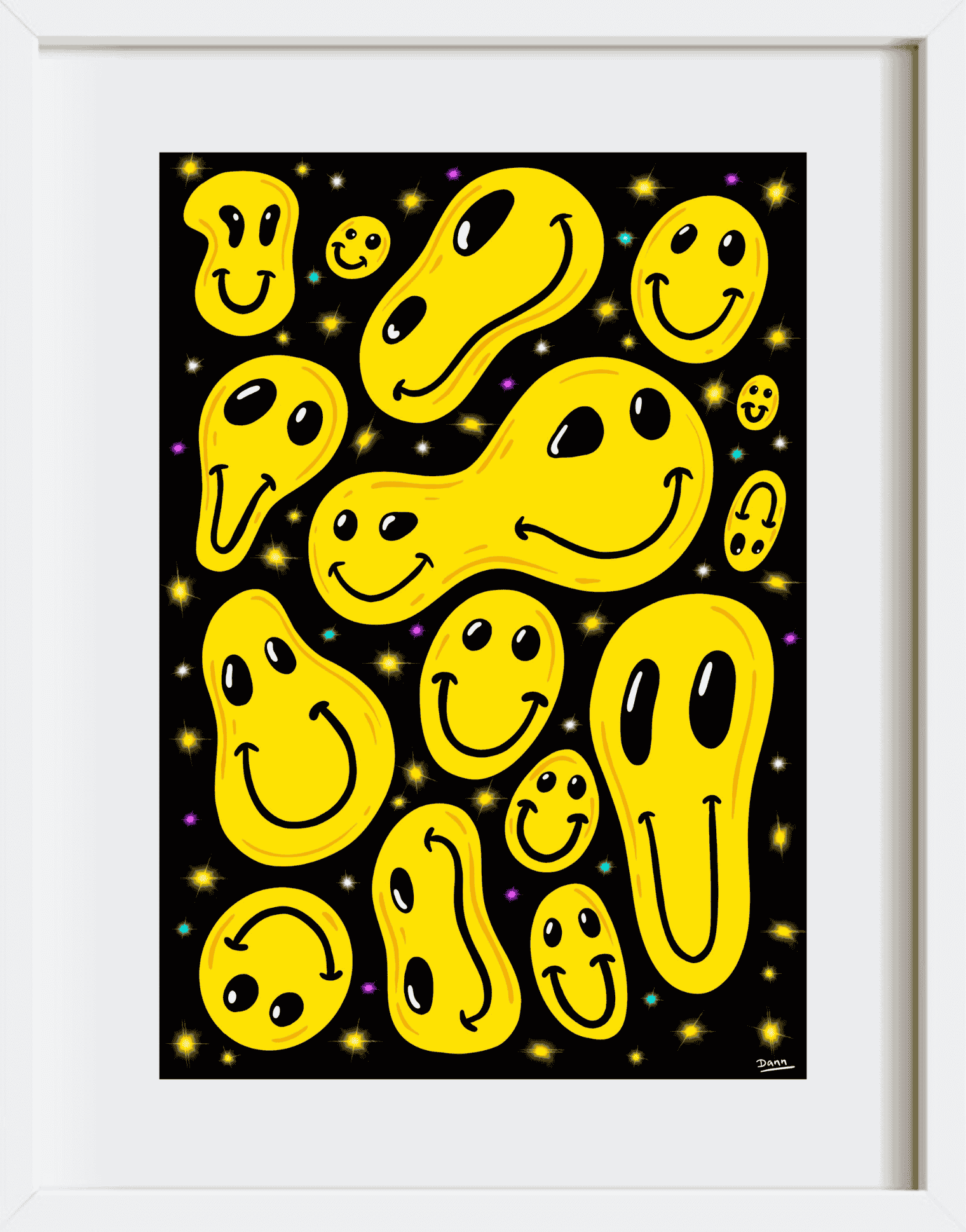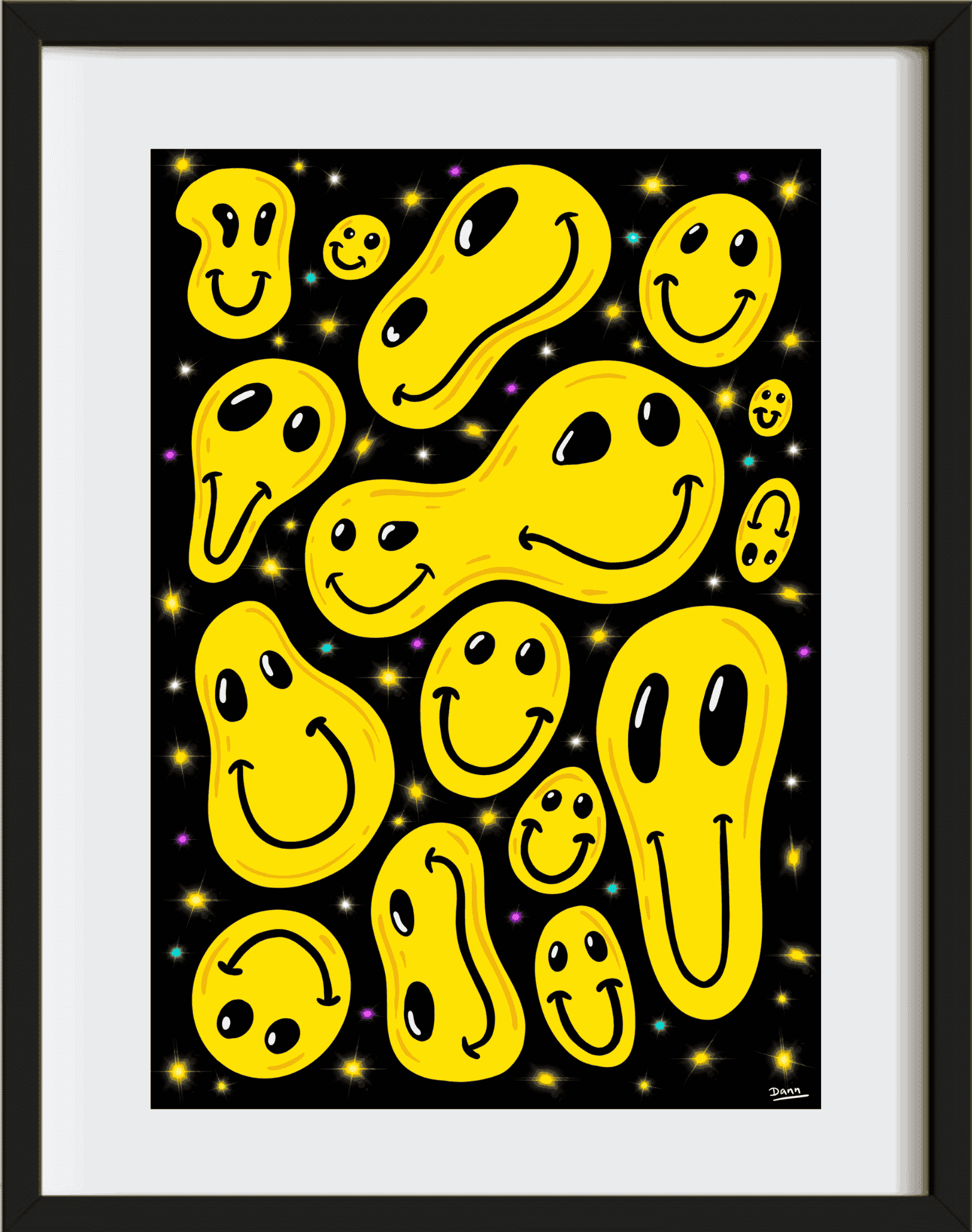 The Dann Taffs Acid Trip print is a bold and psychedelic digital artwork that captures a vibrant, surreal energy. This piece features a swarm of smiley faces pulled and stretched into different shapes, floating in deep black space. From the first glance, it immerses viewers in a playful and trippy visual experience.