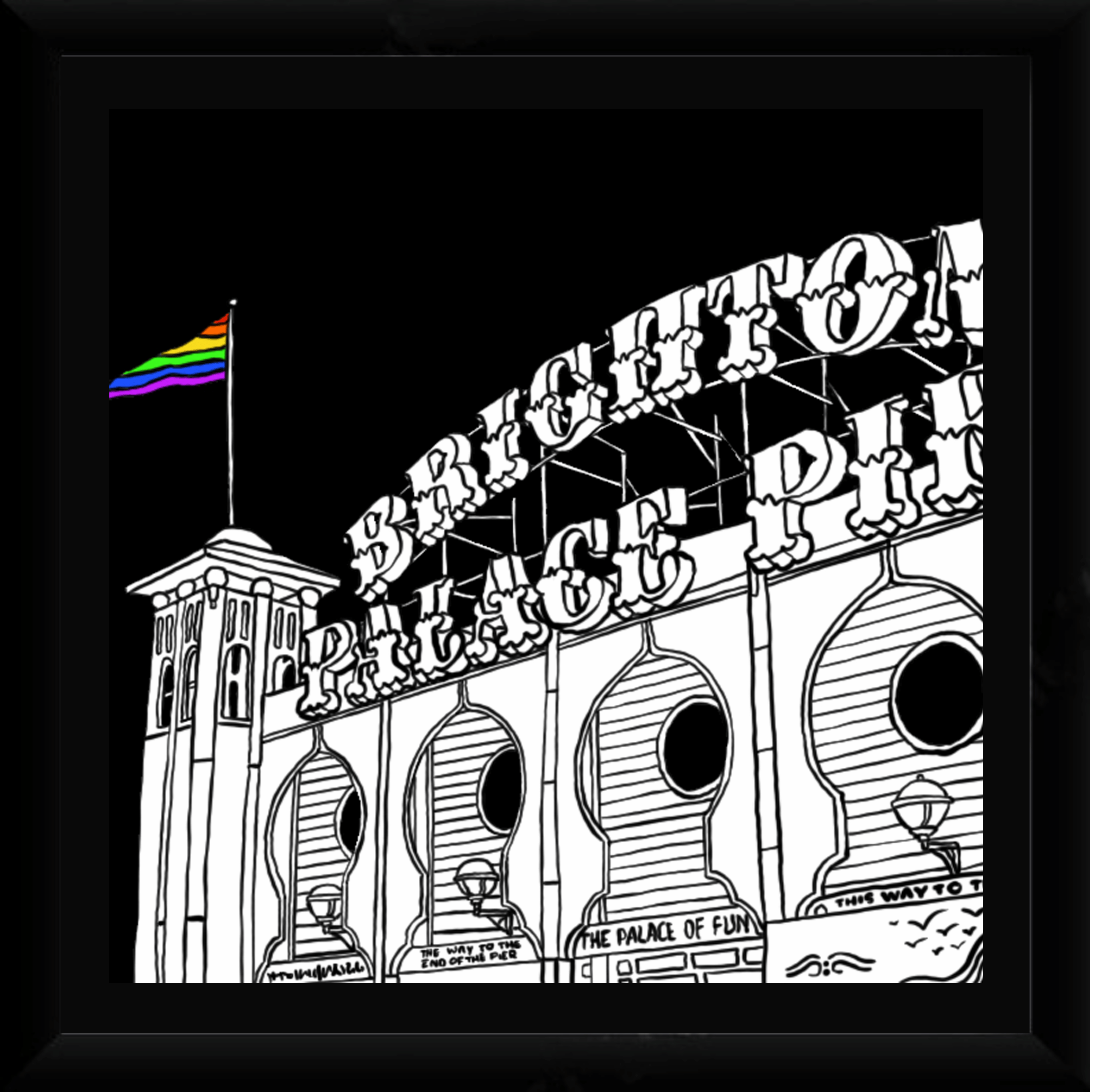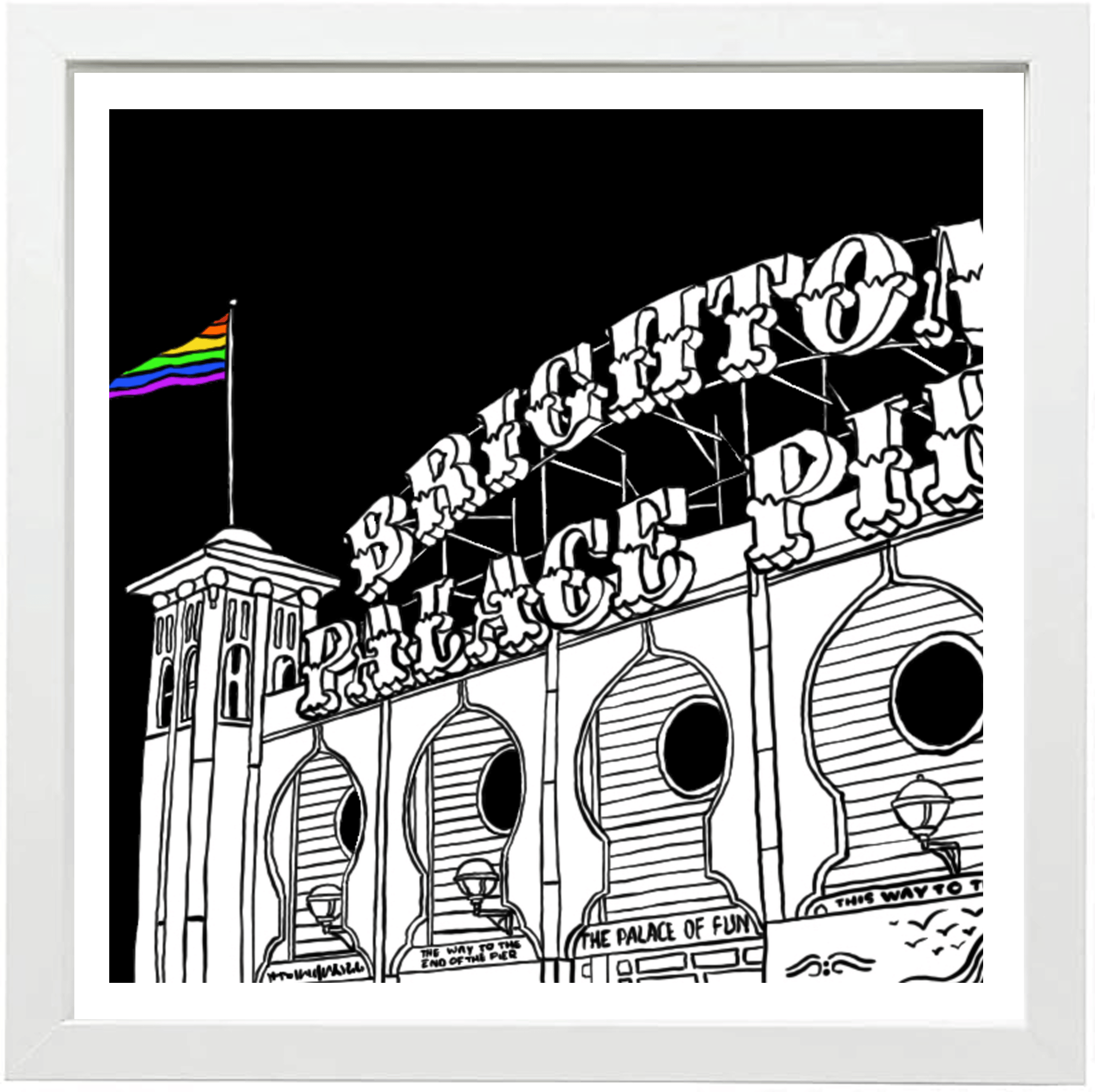 The Brighton Pier print by Dann Taffs is a striking digital artwork that celebrates one of the UK’s most iconic coastal landmarks. It depicts the front entrance of Brighton Pier drawn in bold black lines against a clean white background. Meanwhile, a vivid rainbow Pride flag waves proudly at the top, adding a powerful splash of colour and meaning.