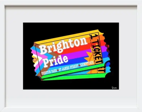 Celebrate the spirit of Brighton Pride with this vibrant digital artwork by Dann Taffs. Brighton Pride Tickets captures the energy, history, and joy of one of the UK’s most iconic LGBTQ+ events. Each ticket in the artwork acts as a miniature time capsule—full of colour, bold typography, and the promise of freedom, glitter, and dancing in the streets.