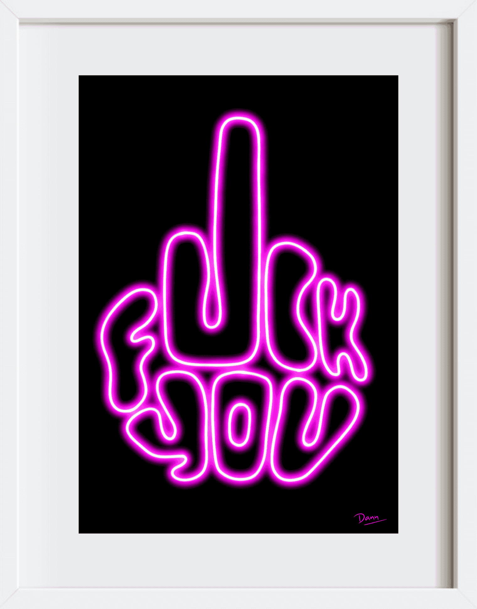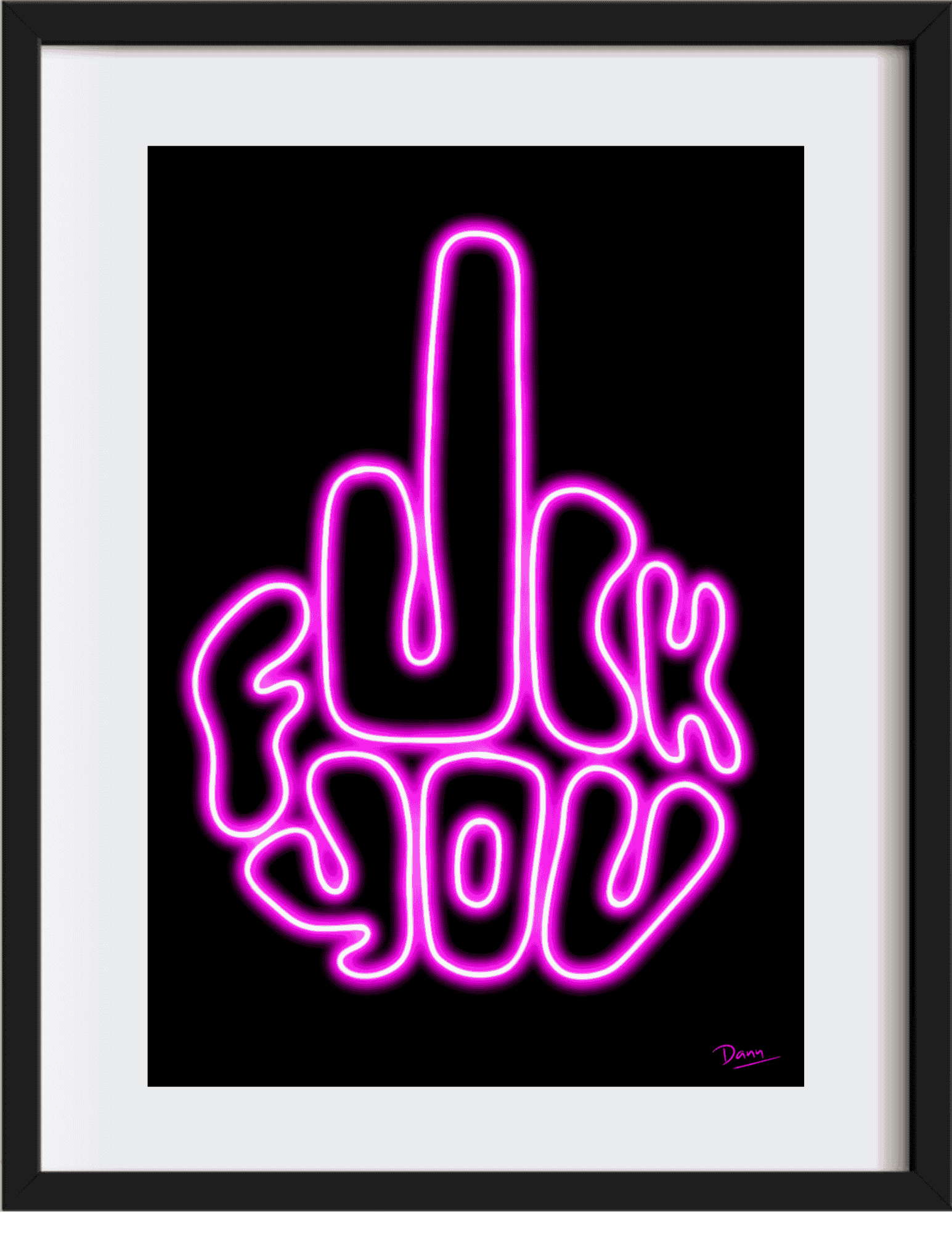 The F*ck You print by Dann Taffs is a bold and rebellious digital artwork that turns attitude into art. Featuring bright pink neon lettering that forms the shape of a hand giving the middle finger, this piece captures defiance, humour, and empowerment all at once. It’s cheeky, unapologetic, and full of personality—an unforgettable visual statement about confidence and freedom of expression.