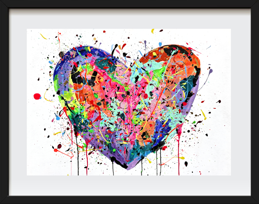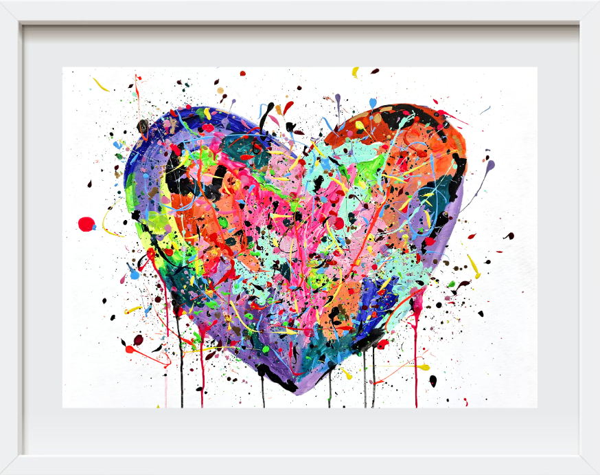 Heartburst by Emily Bowyer is a vibrant and expressive print that celebrates love, emotion, and the beauty of human connection. The artwork depicts a colourful heart at its centre, surrounded by dynamic splashes of paint that radiate energy and joy. Furthermore, Emily’s bold use of colour and expressive brushwork makes the heart feel alive, evoking feelings of warmth, passion, and optimism. This piece reflects her ongoing exploration of love as a central theme in her art.