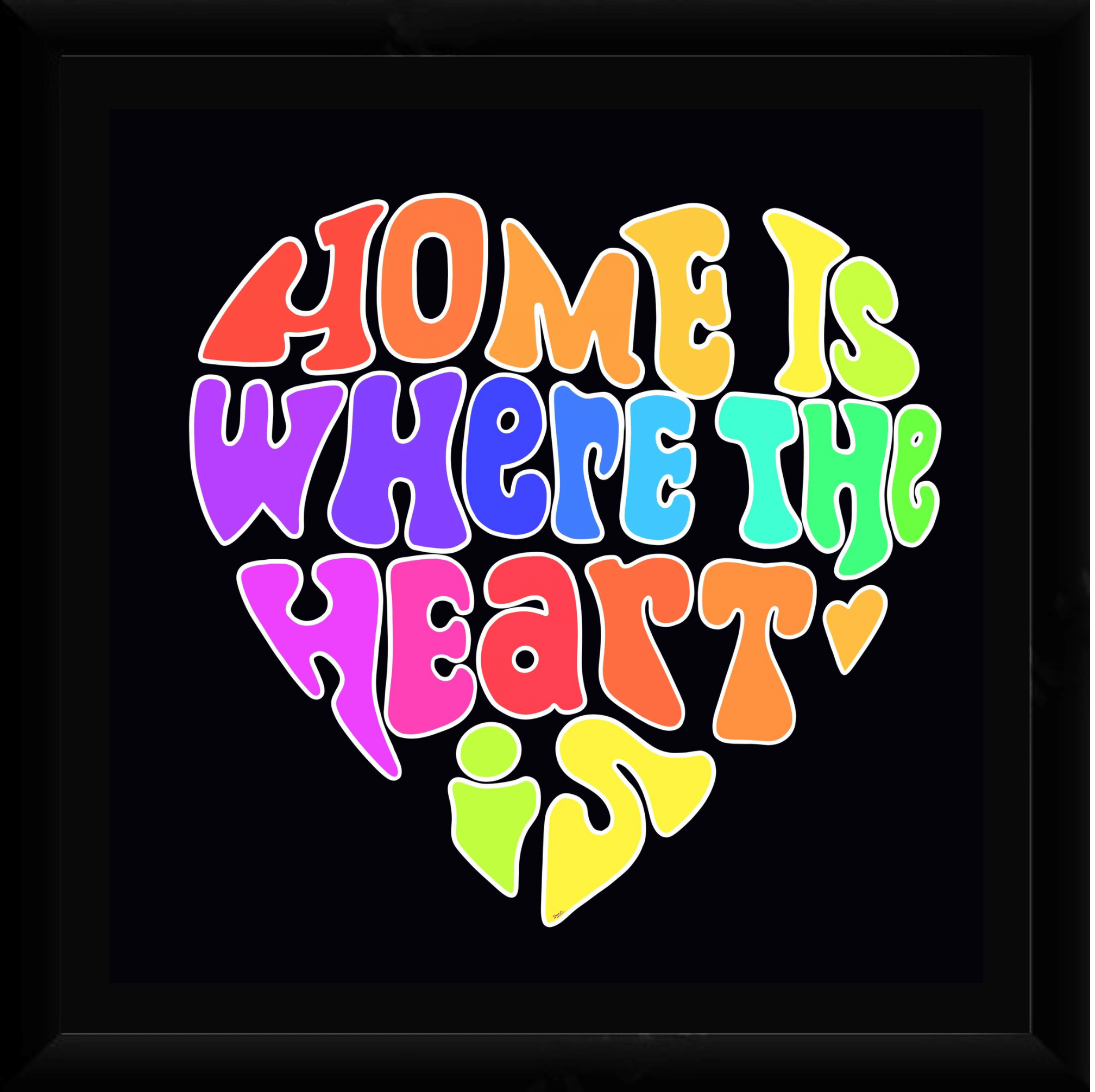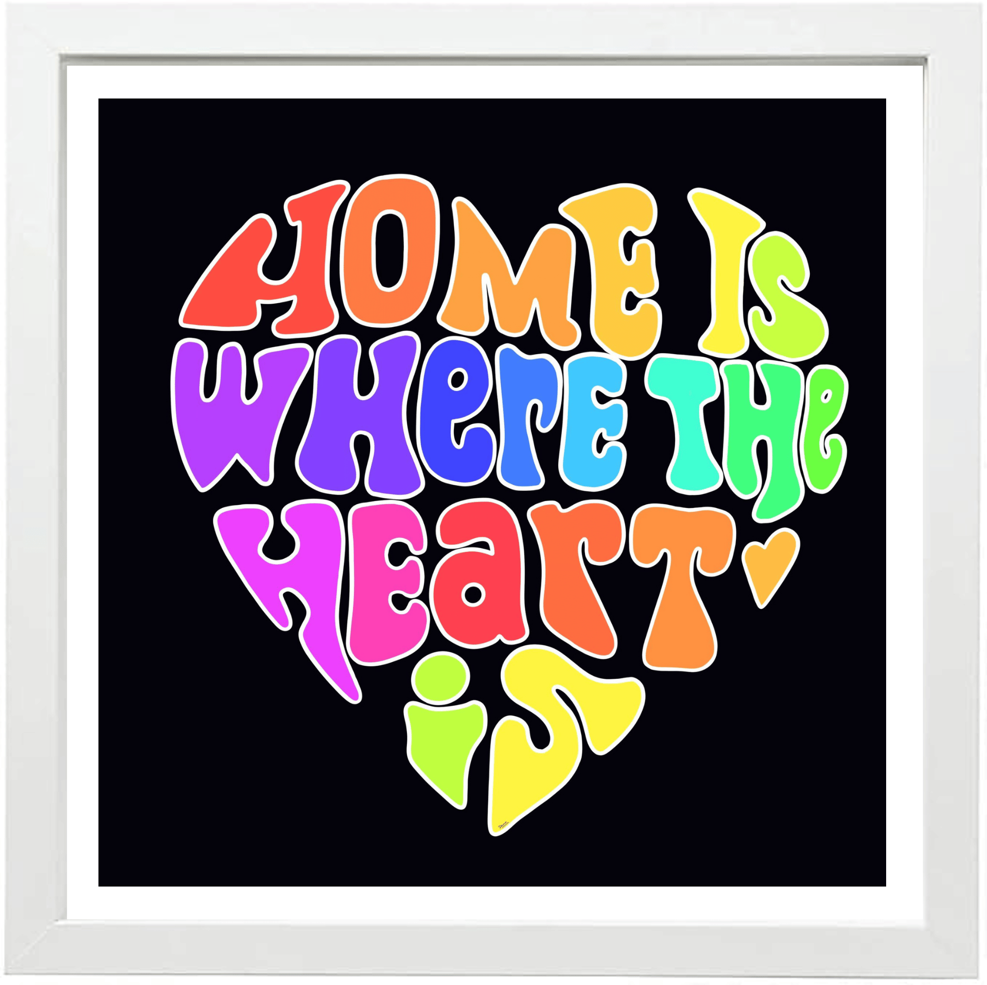 The Home Is Where the Heart Is print by Dann Taffs is a joyful artwork that celebrates love, comfort, and belonging. Measuring 60 x 60 cm, this digital square print features the phrase “Home Is Where the Heart Is” shaped into a heart. The text is designed in a bold 1960s-style font, giving it a nostalgic yet modern look that brightens any space.