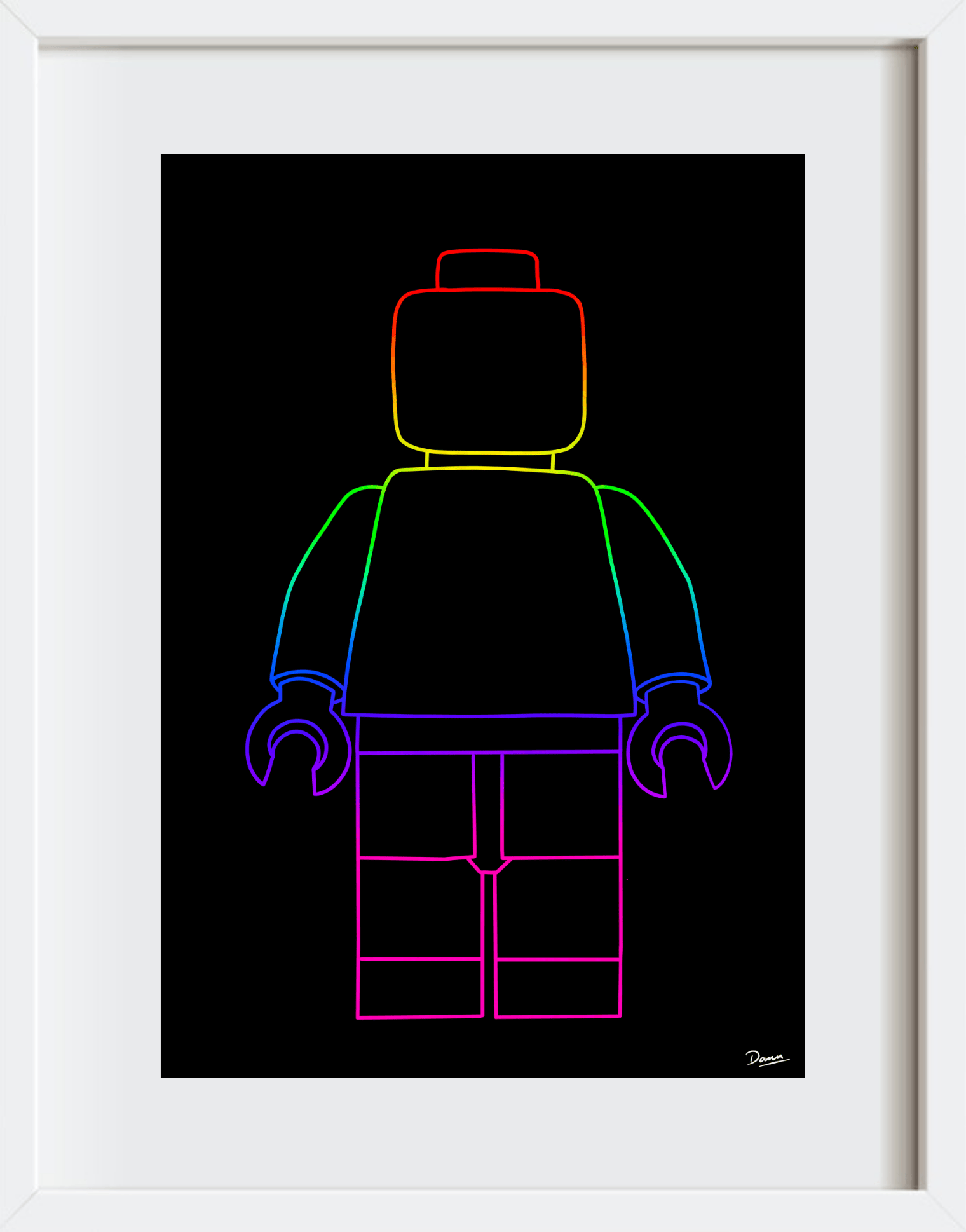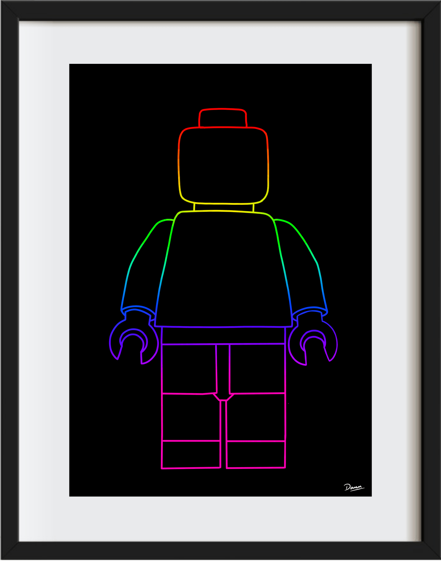 Lego Man by Dann Taffs is a striking piece of digital art featuring a rainbow outline of a classic Lego figure set against a bold black background. This vibrant artwork combines playful nostalgia with modern design, making it a captivating statement for any space. Dann Taffs’ use of bright, contrasting colours brings energy and personality to this minimalist composition.