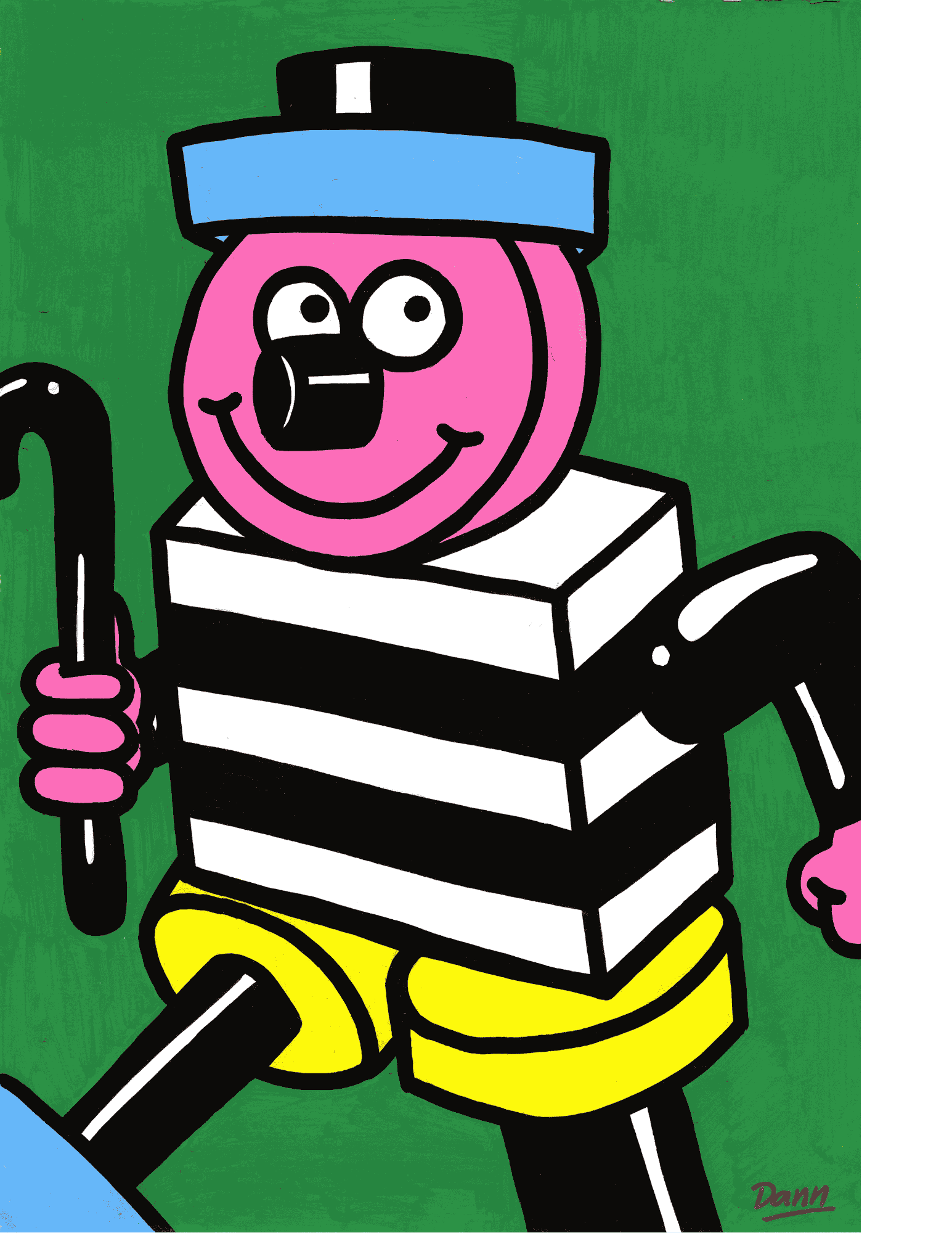Dann’s Liquorice Man captures movement and joy through minimal, expressive design. The bold contrast between the dark liquorice figure and the vibrant green background creates instant visual impact, while the character’s jaunty walk adds a sense of optimism and fun. The piece feels alive, as if the little liquorice figure might march straight off the page.