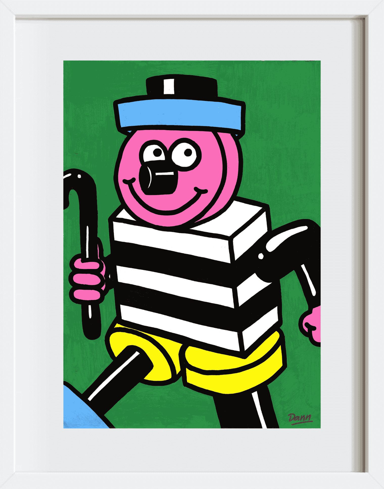 The Liquorice Man print by Dann Taffs is a whimsical and nostalgic digital artwork inspired by the playful charm of childhood sweets. Against a bold green background, a figure made entirely of liquorice strides confidently forward, each limb and curve outlined with Dann’s signature balance of humour and style. It’s simple at first glance, yet it carries a quirky personality that feels both familiar and surreal—like something from a dream or a retro sweet shop memory.