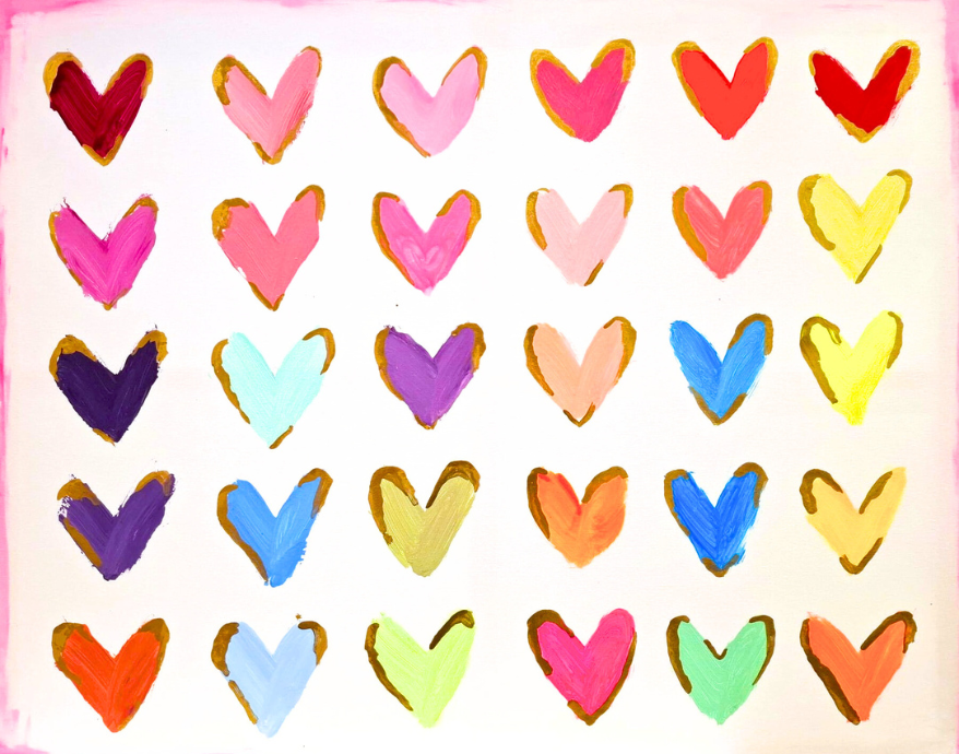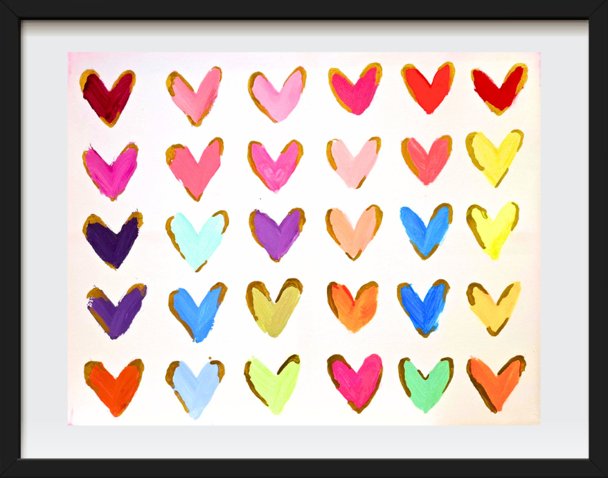 Love is an A1 art print by Emily Bowyer. She is known for colourful pieces that explore emotion and human connection. In this artwork, she fills the page with rows of bright hearts. Each heart has its own unique colour, giving the piece a lively rhythm. A soft gold outline surrounds every heart, adding warmth and elegance.