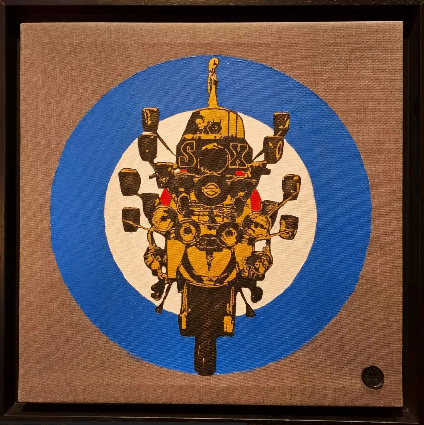 “Mods Magic” is a striking piece that blends the sleek power of a motorbike with the iconic symbols of the mod culture. The artwork features a detailed, dynamic motorcycle set against a bold target background, symbolising the spirit of freedom and rebellion. The combination of crisp lines and energetic brushwork captures the essence of the mod lifestyle, with a focus on movement and style.