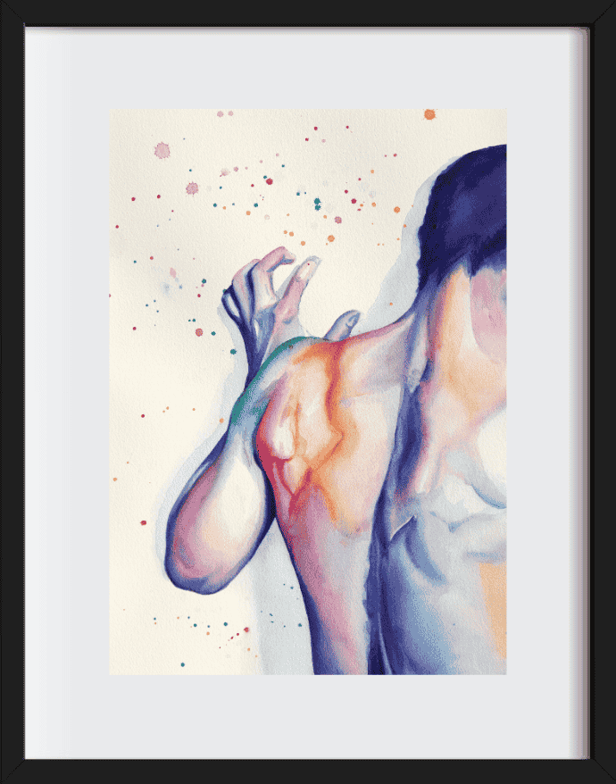 Pride in Your Skin by Lorenza Gamberi is a limited-edition print that celebrates queer identity, confidence, and visibility. The artwork depicts the strong back of a man, his muscular form painted in radiant rainbow hues. Each colour flows across the contours of his body, transforming the figure into a living symbol of pride and self-acceptance.