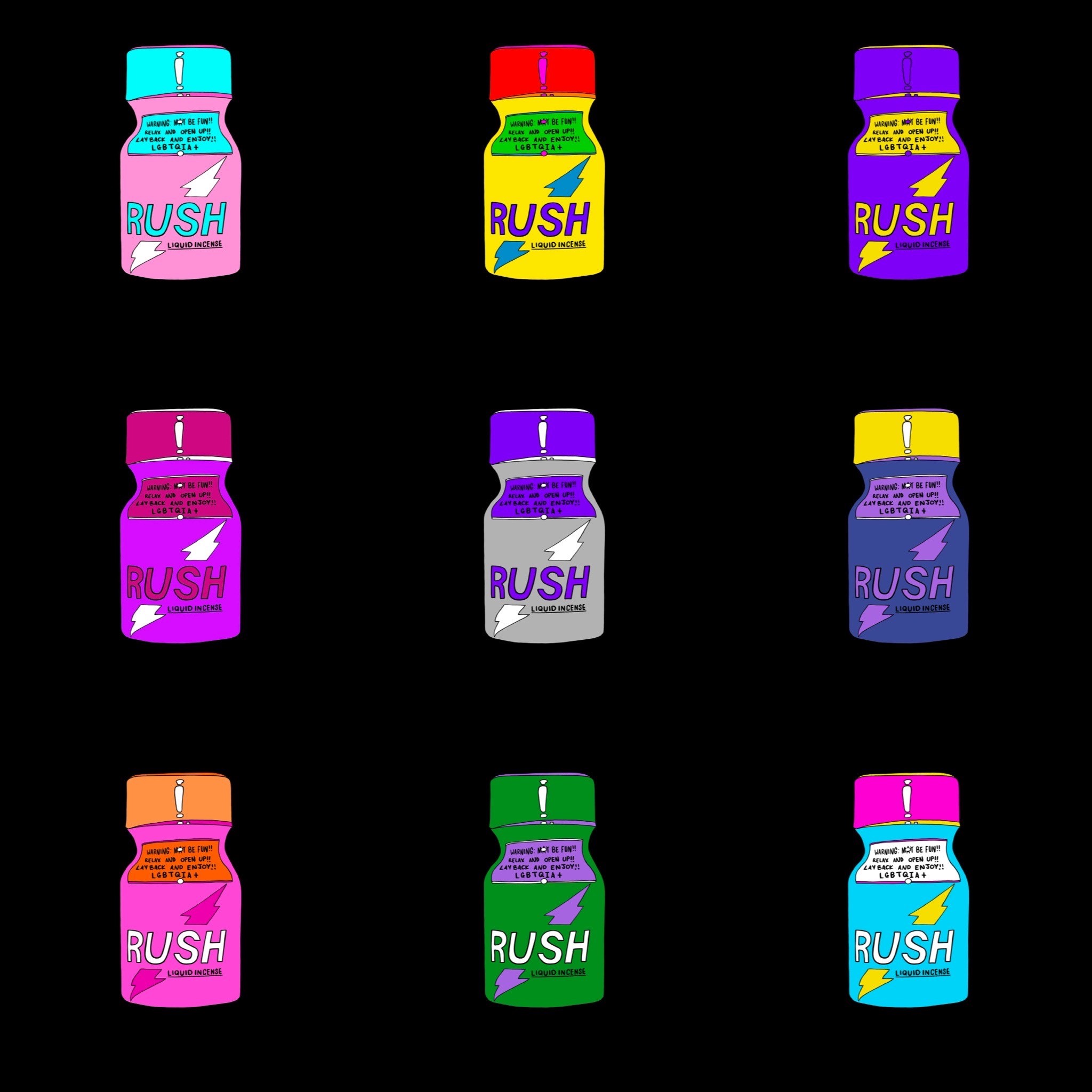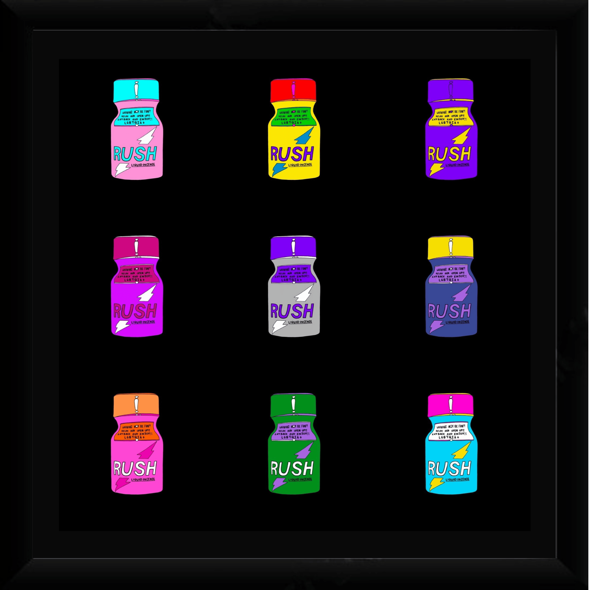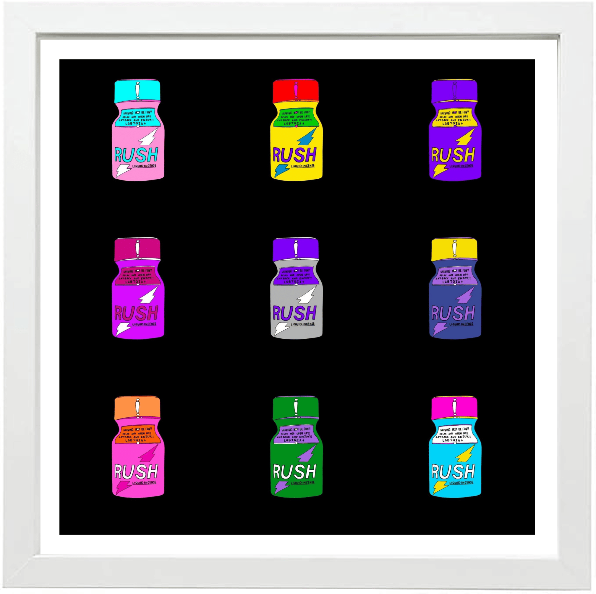 The Rush Collection print by Dann Taffs celebrates colour, fun, and playful rebellion. This digital artwork features nine bottles of Rush Poppers, each designed individually in bold neon hues. Messages such as “Warning: May Be Fun,” “Relax, Open Up,” “Laze Back and Enjoy,” and “LGBTQIA+” pop from each bottle, blending humour with energy and inclusivity. Together, they create a lively, cheeky composition full of personality.