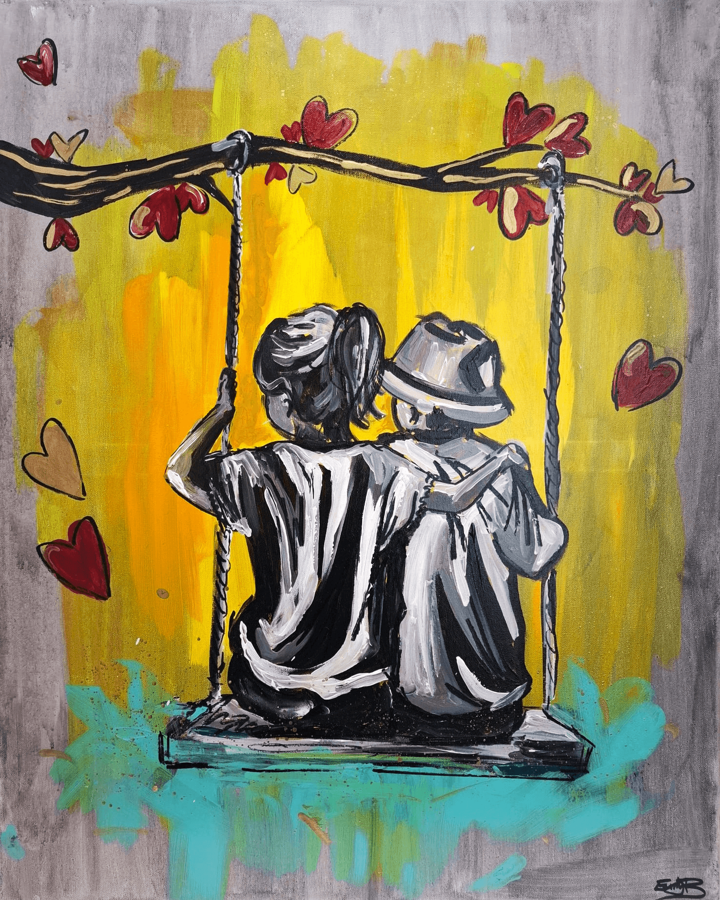 The Sibling Love painting by Emily Bowyer is an original hand-painted canvas celebrating family, care, and affection. It depicts a brother and sister hugging while sitting on a swing, surrounded by vibrant love hearts hanging from the tree branch above. The playful, Banksy-inspired style adds charm and warmth, making this piece heartwarming and visually captivating.
