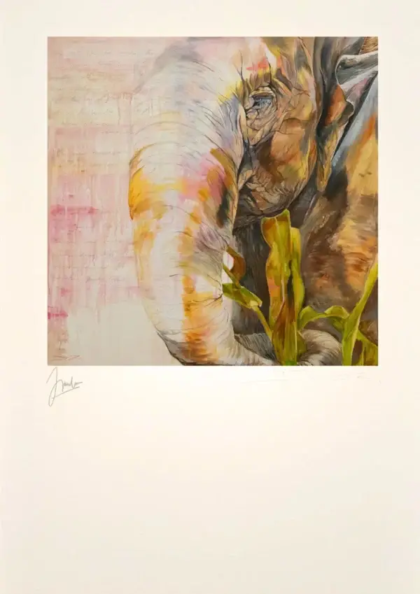 This exquisite large-scale painting, titled “The Duchess,” portrays the regal beauty and grace of an elephant. Painted in rich, expressive tones, the artwork captures the depth and wisdom in her eyes, emphasizing her powerful yet gentle nature. The artist, renowned for their ability to capture emotion and detail, brings this majestic creature to life, making it a truly captivating and dignified piece.